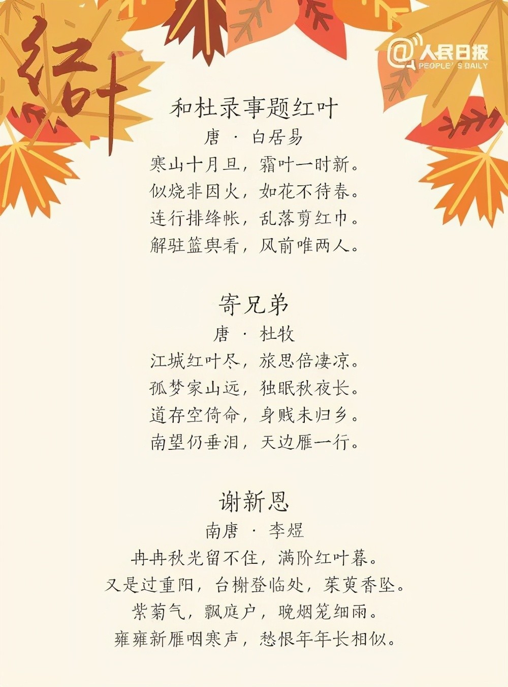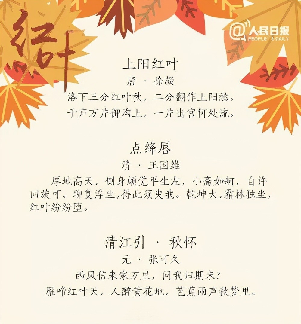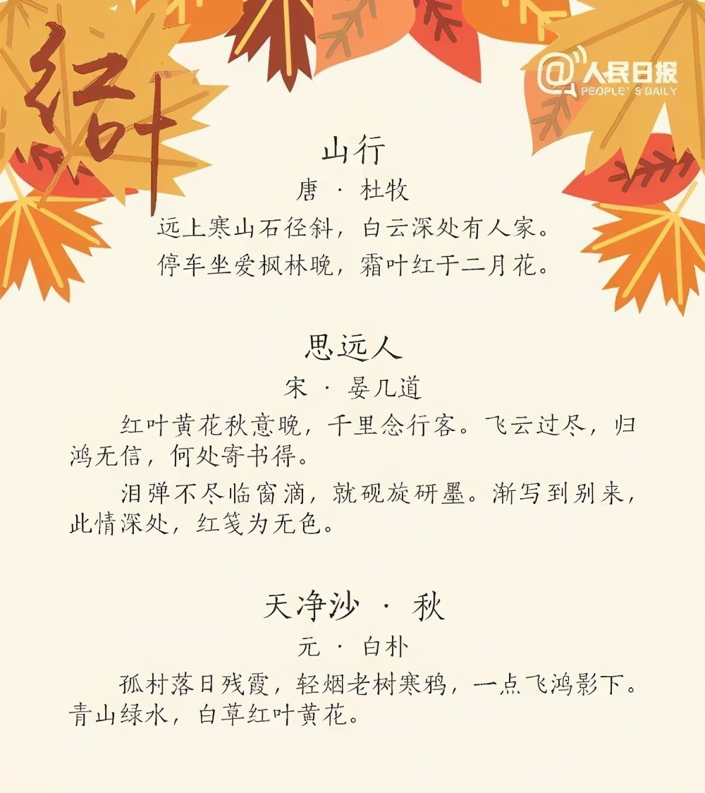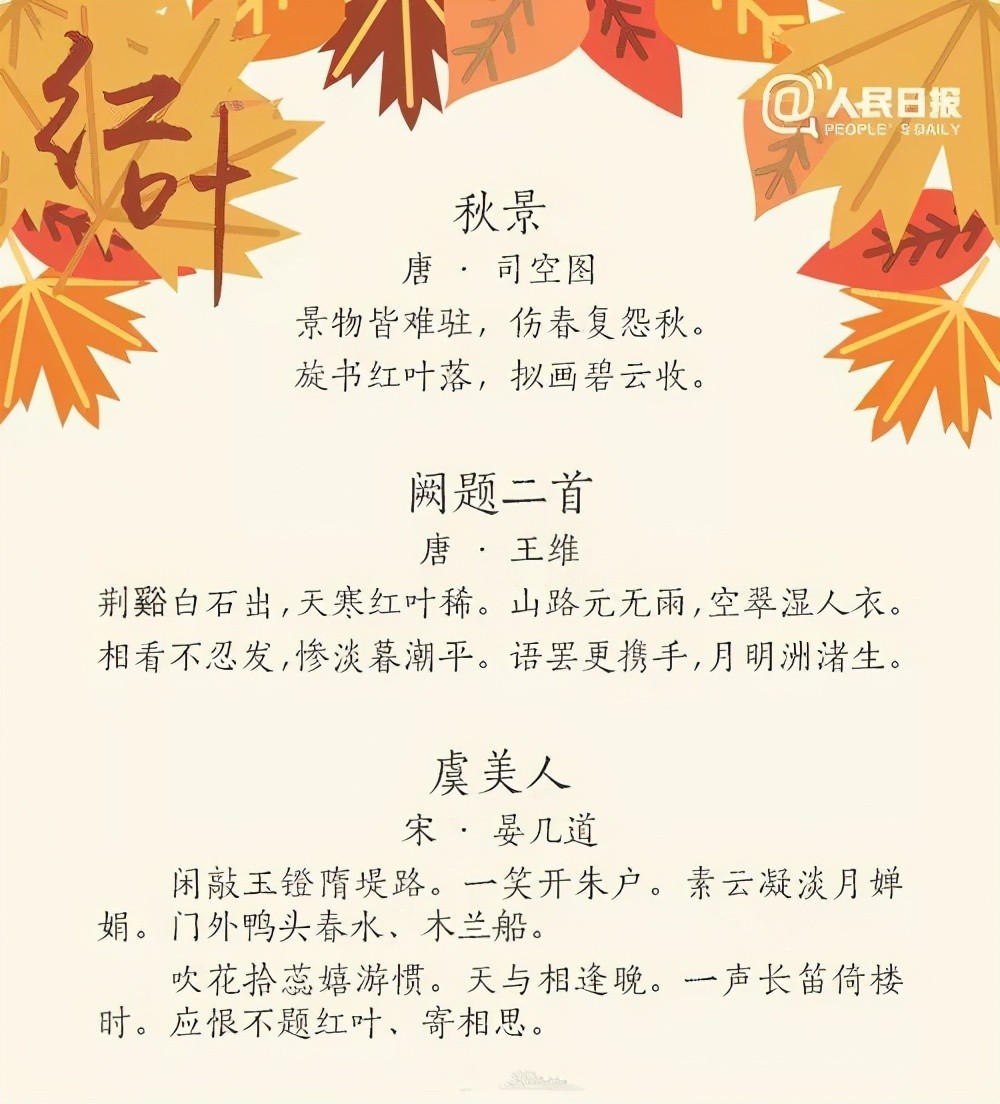 秋意渐渐远去,初冬已经来临,寒意渐浓,此时的大江南北正是观赏红叶的好时节。红叶片片飘飞,挑动古代文人骚客的情思,他们用文字给予了这些事物以灵魂,今天分享人民日报整理的27首唯美红叶诗词,带我们一起欣赏祖国的大好河山。