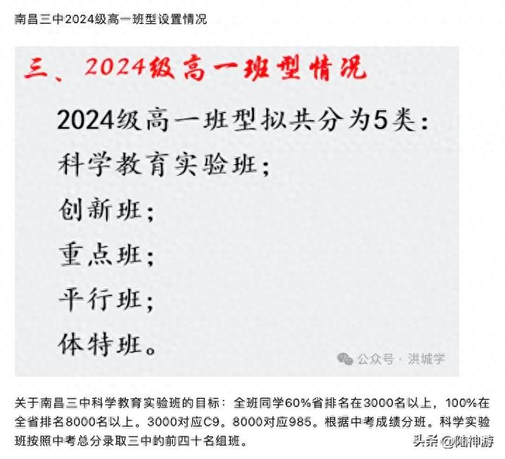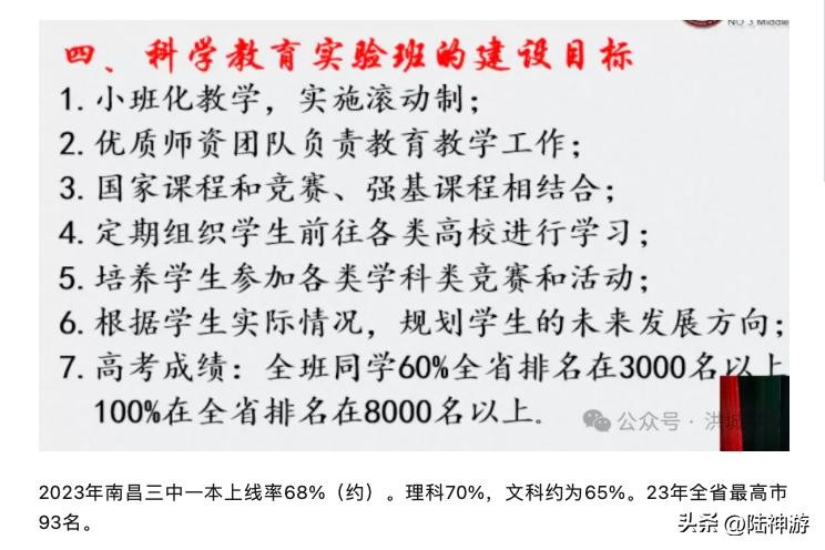 关于南昌三中科学教育实验班的目标:全班同学60%省排名在3000名以上,100%在全省排名8000名以上。3000对应C9。8000对应985。根据中考成绩分班。科学实验班按照中考总分录取三中的前四十名组班。