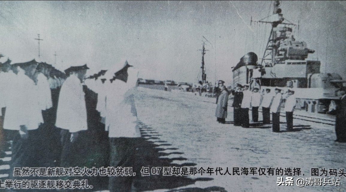 虽然不是新舰对空火力也较贫弱。但07型却是那个年代人民海军仅有的选择, 图为码头上举行的驱逐舰移交典礼