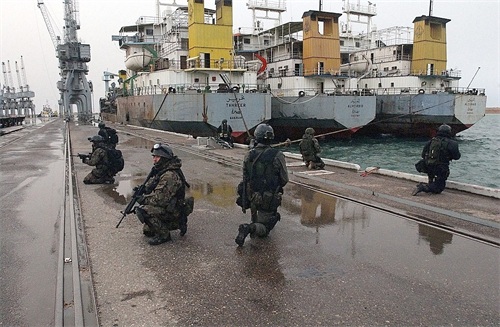 联军部队向法奥半岛发动空中和两栖作战,以保全那里的油田和重要港口,英国皇家海军、 波兰海军和澳洲皇家海军的军舰都参与了支援。美国海军陆战队的第15海军陆战队远征部队、英国第3突击旅和波兰机动反应作战特种部队袭击了乌姆盖萨尔港,而英国陆军第16空中突击旅去保护在伊拉克南部的油田。波兰突击队保护海上石油平台附近的港口,防止被敌军破坏。