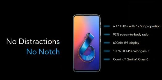华硕ZenFone 6搭载骁龙855处理器,配备6.3英寸1080 x 2340分辨率显示屏,宽高比为19.5:9,采用第六代康宁大猩猩玻璃。ZenFone 6内置5,000mAh电池,支持Quick Charge 4.0快速充电技术。其后置双摄采用了索尼IMX586 4800万像素主传感器和1300万像素广角镜头,使用了可翻转设计,翻转过来后可以充当前置摄像头。