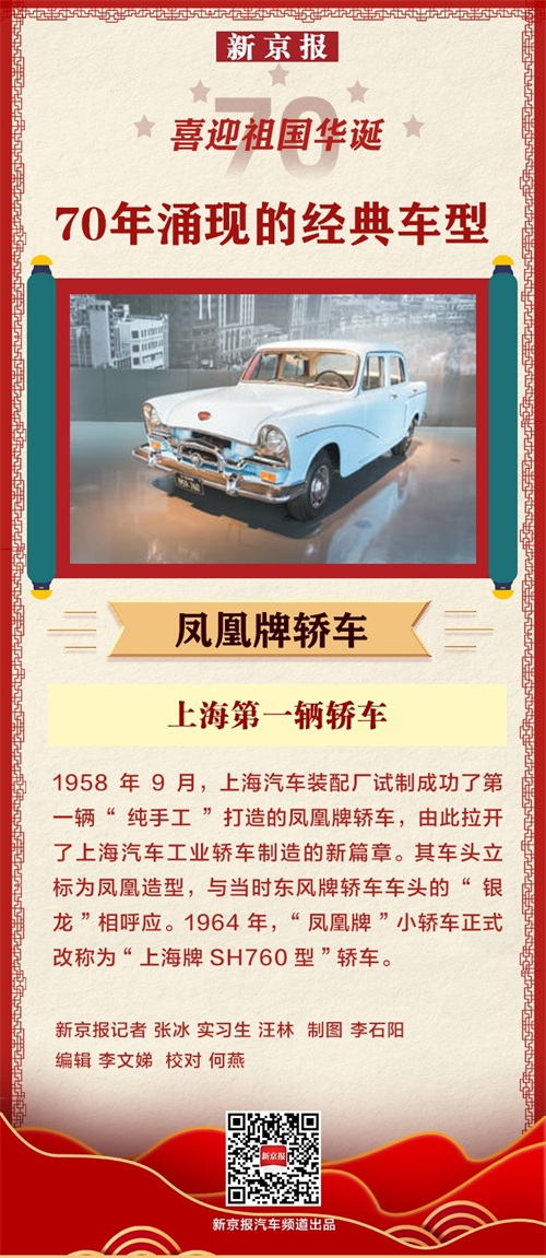 1958年9月,上海汽车装配厂试制成功了第一辆“纯手工”打造的凤凰牌轿车,由此拉开了上海汽车工业轿车制造的新篇章。其车头立标为凤凰造型,与当时东风牌轿车车头的“银龙”相呼应。1964年,“凤凰牌”小轿车正式改称为“上海牌SH760型”轿车。