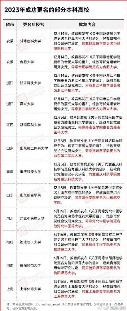 2023年,教育部重启本科高校设置和高校更名工作。今年以来,多个省市教育厅陆续发布了本省《关于申报设置本科学校的公示》《关于2023年申报更名大学事项的公示》等文件,全国高校设置工作有条不紊。经省教育厅、教育部考察和公示后,一批学院厚积薄发,成功更名大学,实现了办学层次和社会声誉的全面提升。 目前,教育部发布了三批同意高校更名文件。12所以学院命名的本科高校获得批复,办学实力得到认可,为一众力求更名的高校注入强心剂。其中,安徽、山东、浙江有2所高校成功更名,福建、河北、河南、江西、上海、重庆各1所。(广西新闻频道)
