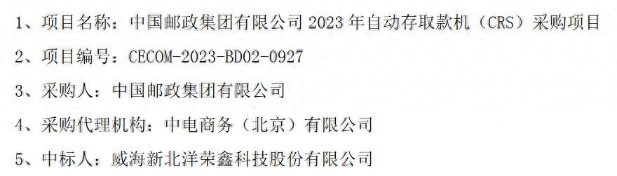 威海新北洋荣鑫科技股份有限公司中标中国邮政集团自动存取款机(CRS)采购项目