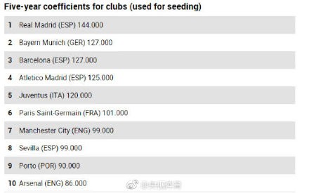 欧足联俱乐部年终排名:皇马第一 拜仁压巴萨