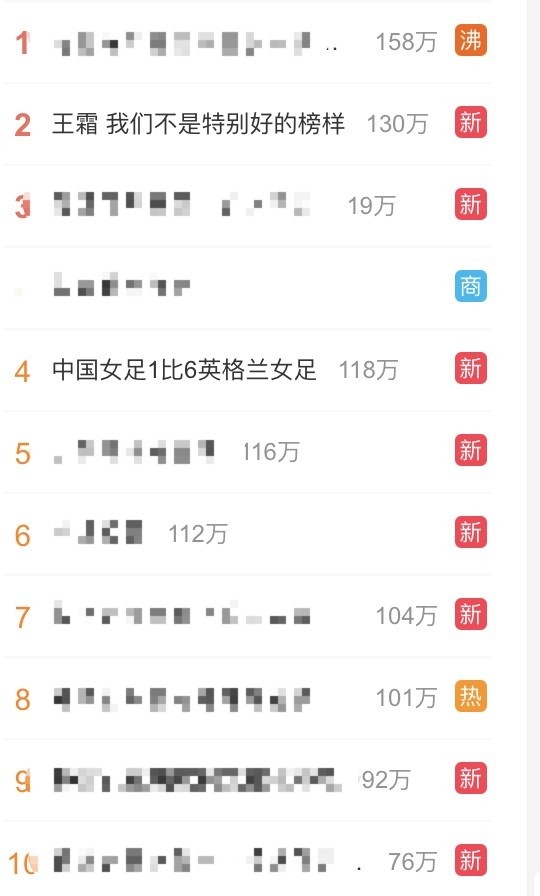 中国女足小组赛末轮1-6惨败给英格兰女足,目前位列热搜榜第4位。