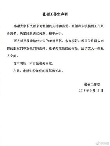 今天中午,张俪在微博发布工作室声明,表示已与韩国演员朱镇模分手,两人因工作原因聚少离多,决定回到朋友关系。