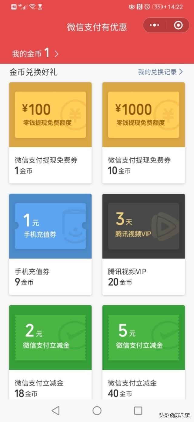 金币可以用来兑换提现免费券,手机充值券,腾讯视频VIP,微信支付立减金。