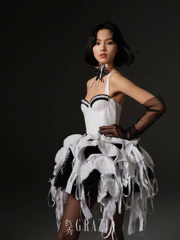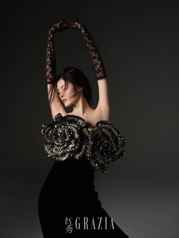 奚梦瑶一袭黑色长纱,性感靓丽。