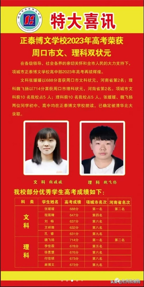 周口正泰博文 魏飞扬 714分,周口市理科状元