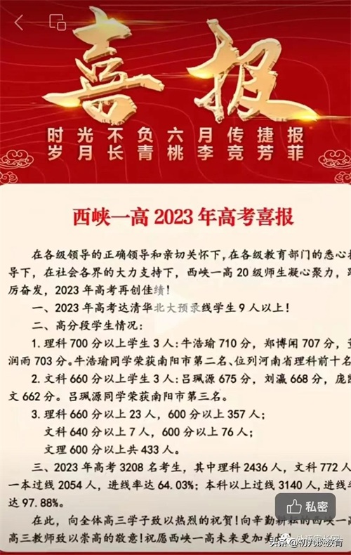河南省理科状元:南阳一中718分,理科704分以上4人,708分以上2人;文科最高分677分,南阳市文科状元;文科660分以上9人,有望冲击清北5人,理科有望冲击清北24人(含强基入围)。