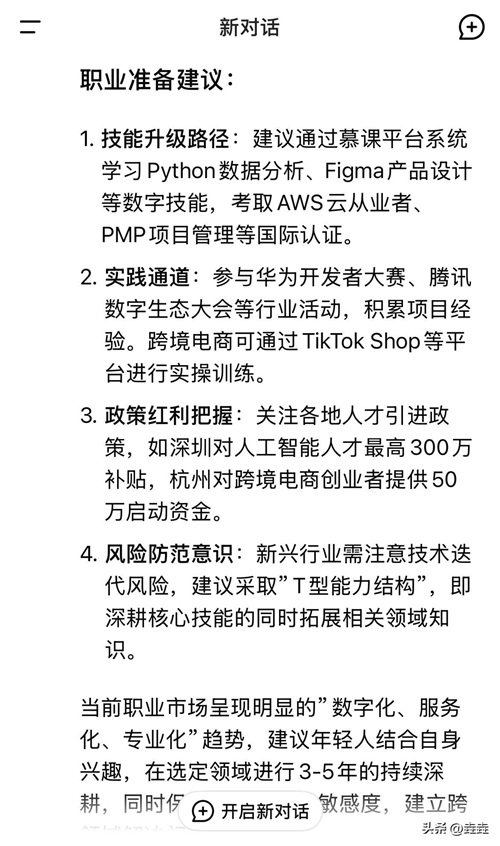 当下社会对于刚步入社会的年轻人极其不友好,尤其是现在各行各业都去趋向于饱和的状态下,放佛年轻人除了进厂打螺丝没有其他办法!那么今天DeepSeek给您带来了新的思路,请您仔细观看!
