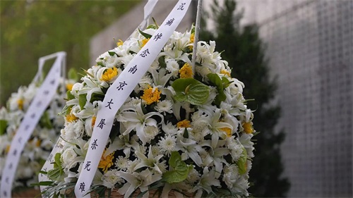 在南京大屠杀遇难者名单墙前,工作人员敬献花篮,全体人员向南京大屠杀死难者鞠躬,死难者遗属代表和学生代表等依次上前献花,表达哀思。