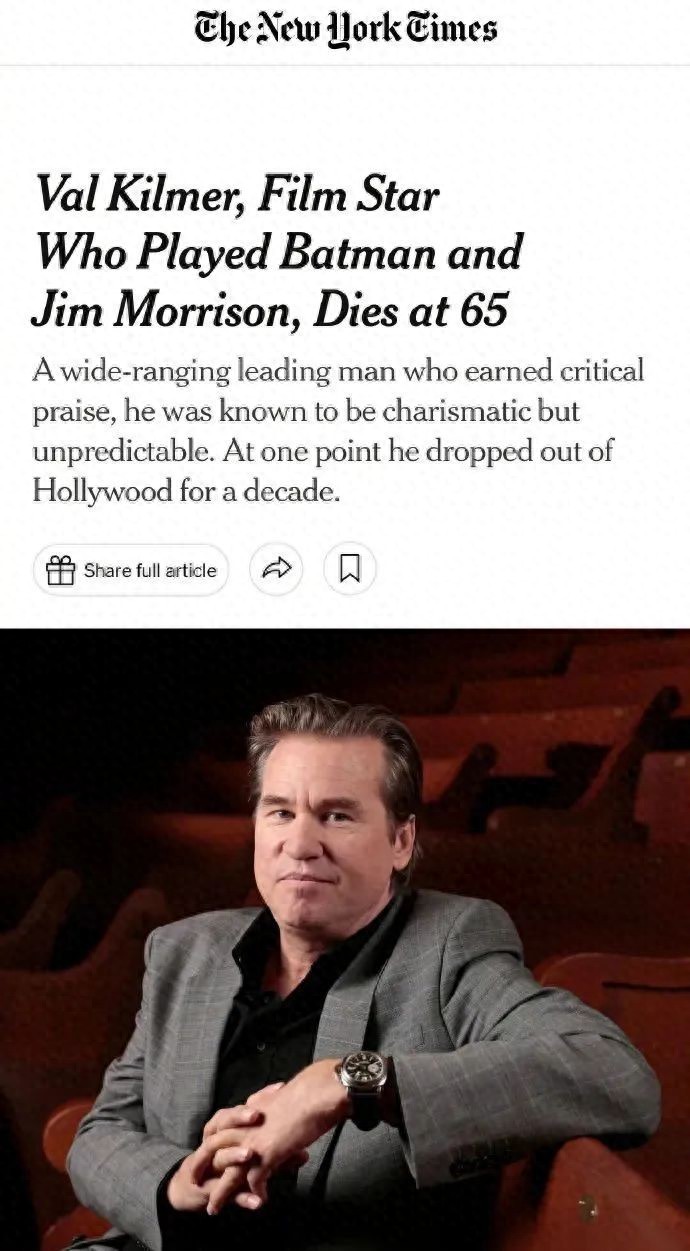 据《纽约时报》报道,好莱坞影星方基默(Val Kilmer)于美国时间4月1日在洛杉矶逝世,享年65岁。他曾演出《壮志凌云》、《永远的蝙蝠侠》、《盗火线》、《神鬼至尊》等多部经典电影走红。其女儿表示死因是肺炎。方基默爆红之际却突然鲜少公开露面,直到2017年证实罹患喉癌并已经抗病2年的消息。
