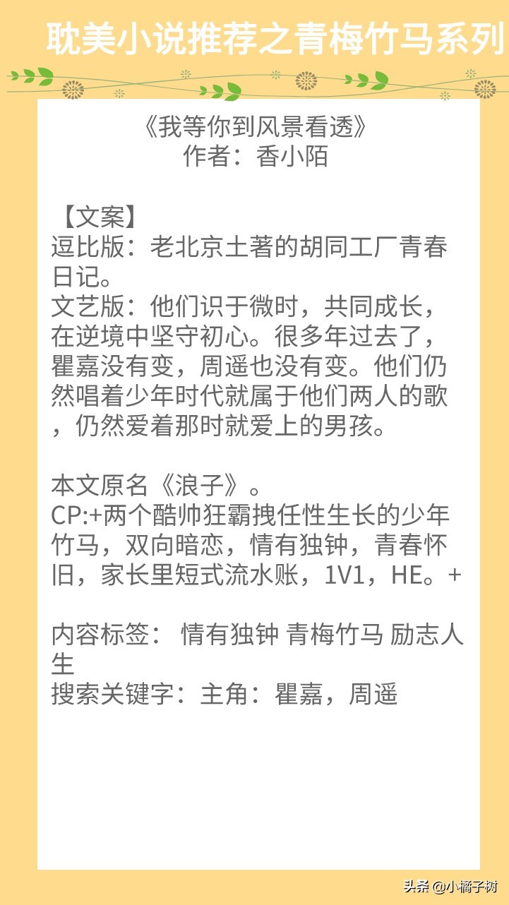 香小陌的《我等你到风景看透》人物设定很丰满,青梅竹马的情感自然而然的转换,细水长流的真情,故事情节千回百转,看完后就感觉,太美好了~