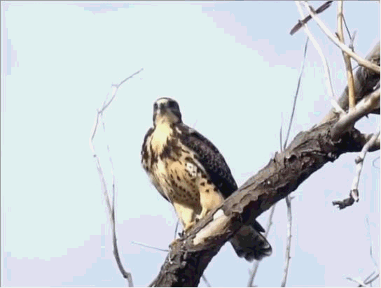 一只鹰在必胜鸟巢穴的周围休息,引起了必胜鸟的注意。见这只鹰没有离开的欲望,必胜鸟将它作为威胁者对待,于是偷袭攻击鹰的头部。
