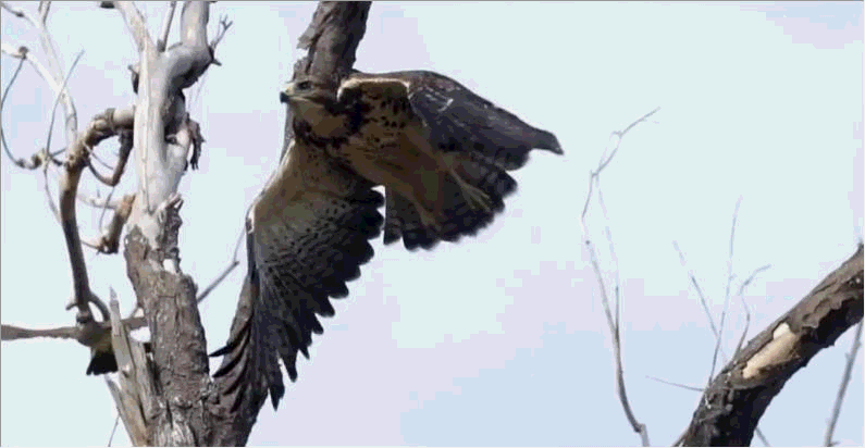 一次成功得手之后,必胜鸟再次从不同的角度飞向鹰,来寻找偷袭的机会。一两次是偶然,多次就是故意所为了,面对必胜鸟不断的偷袭,本来正在休息的鹰立马成为了惊弓之鸟,想要逃离。