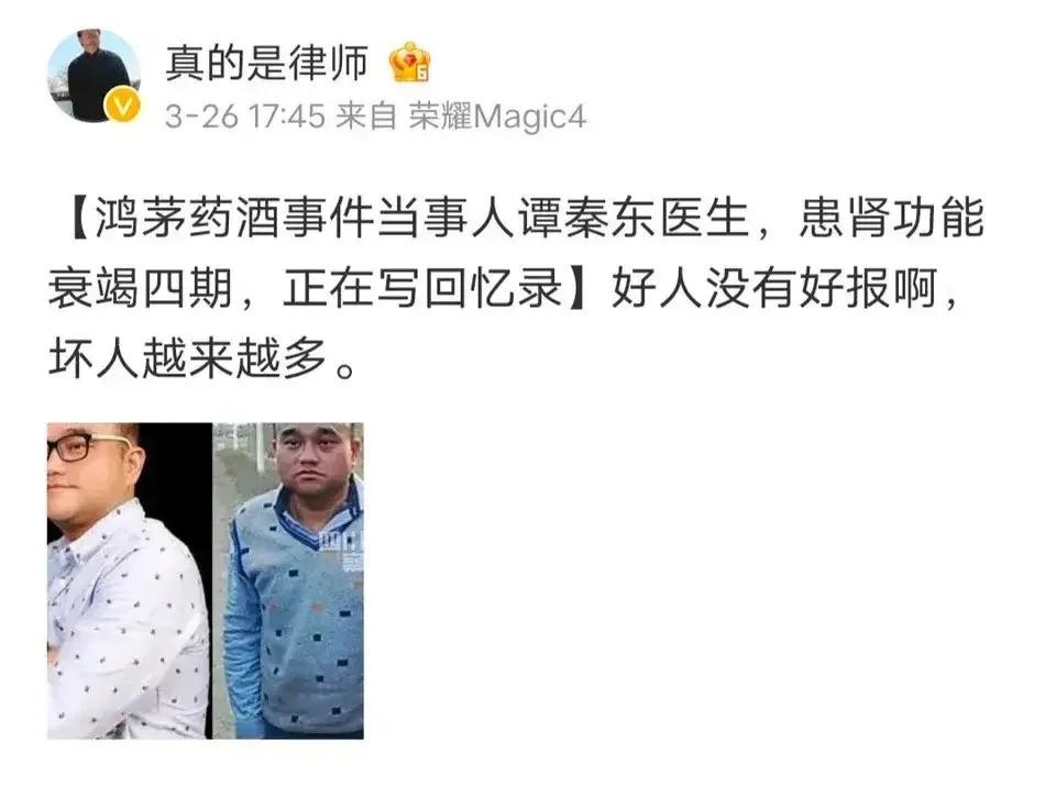 曾因大胆揭露鸿茅药酒问题而遭受跨省执法风波的医学硕士谭秦东,这位曾经怀揣医者仁心、以专业知识挺身而出的勇士,如今却因身体的无情宣判不得不黯然离开了他挚爱的医生岗位。其肾脏功能持续恶化,无情地滑入了衰竭期的深渊,令人扼腕叹息。