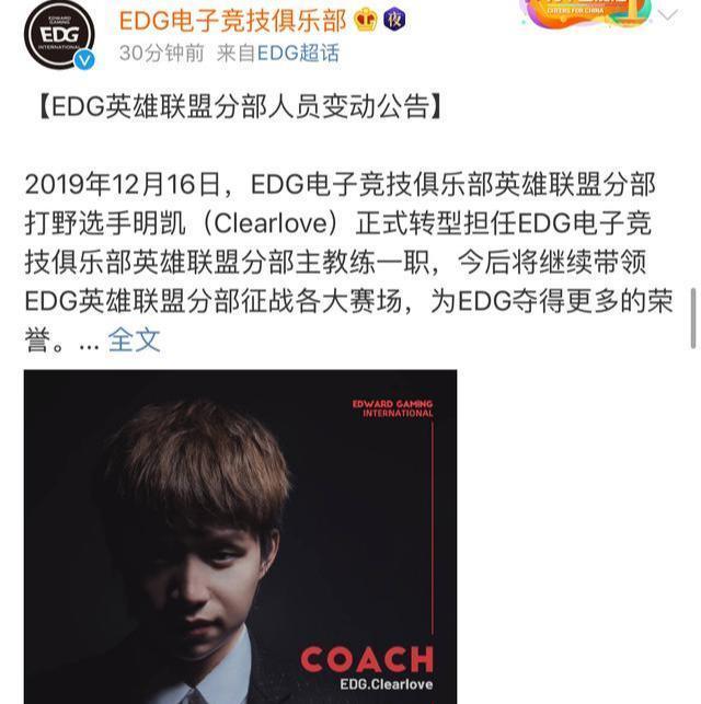 EDG发布了官宣,官宣原文如下,陈述了一下厂长过往的一些职业经历和荣誉之后,EDG表示从今天开始,厂长正式成为EDG英雄联盟分部的主教练。