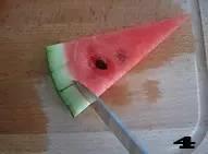 ❹ 取其中一份,用刀切去一半瓜皮即可。