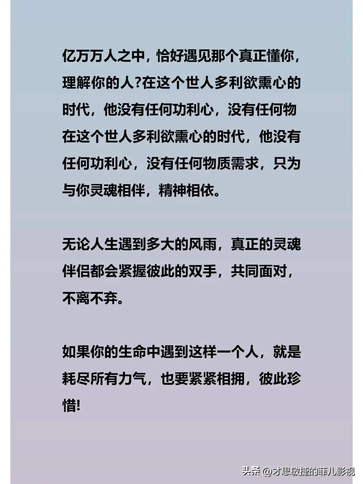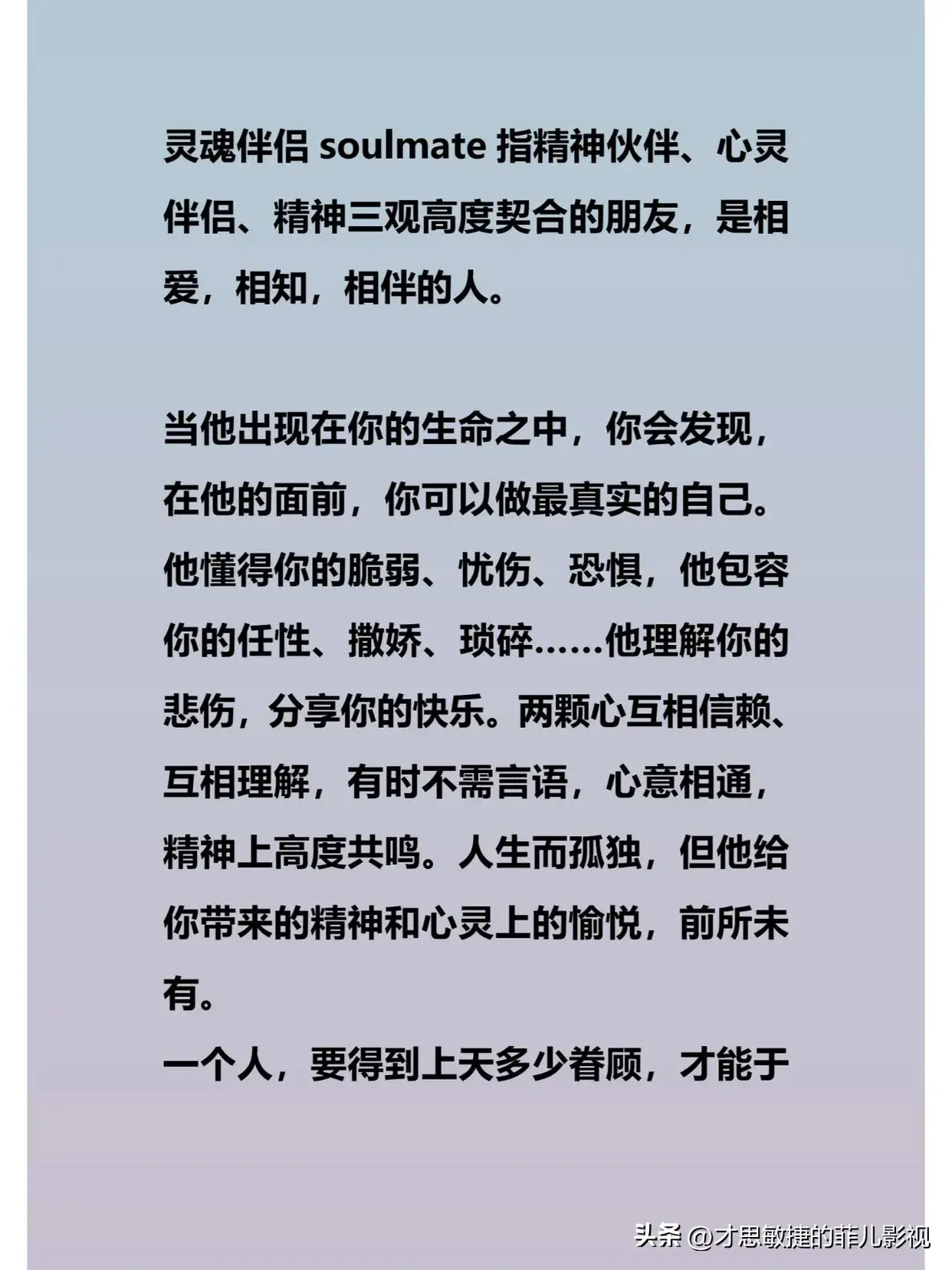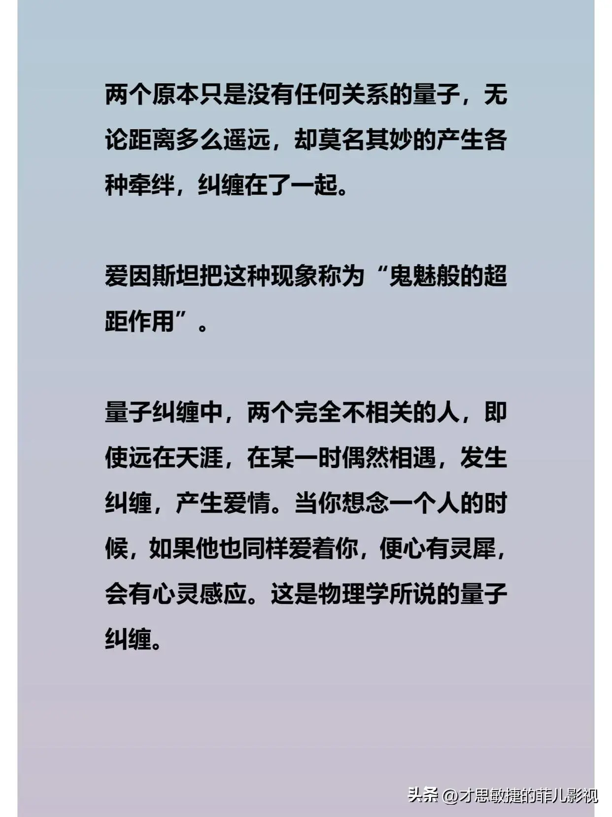 量子纠缠和灵魂伴侣的结合体也意味着,当两个人成为灵魂伴侣时,他们的心灵和思想就会达到一种最高的境界,这种境界是理解和欣赏,是心疼和惺惺相惜,是“卿须怜我我恋卿”。这种境界是内心与内心的全然唤醒,是灵魂与灵魂的最深抵达。