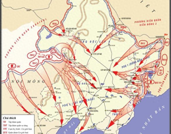 1945年8月8日,苏联对日宣战。次日凌晨,苏空军发动大规模空袭,夺取东北地区制空权。同时,苏军太平洋舰队航空兵也发动空袭,彻底夺取制空权。拂晓,苏军的钢铁洪流开始进攻。由外贝加尔方面军联同外蒙军队穿越戈壁和大兴安岭,从侧后向日军发起进攻。