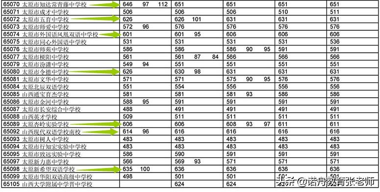 2021年7月7日,太原市教育局公布了2021年中考招生各高中院校录取分数线,公立院校中:山西大学附属中学以674分再次摘得全省高中第一的桂冠,太原五中(龙城校区)以661分为例第二,太原五中(青年路校区)以659分为例第三,山西省实验中学654分排名第四,作为山西省前三好的学校,这三所学校的排名很稳定,排名之后的是639分的太原外国语学校(摄乐校区),638分的太原市成成中学(晋源校区),637分的太原师范学院附属中学,具体信息如下: