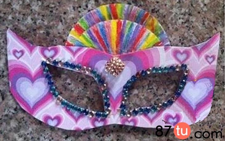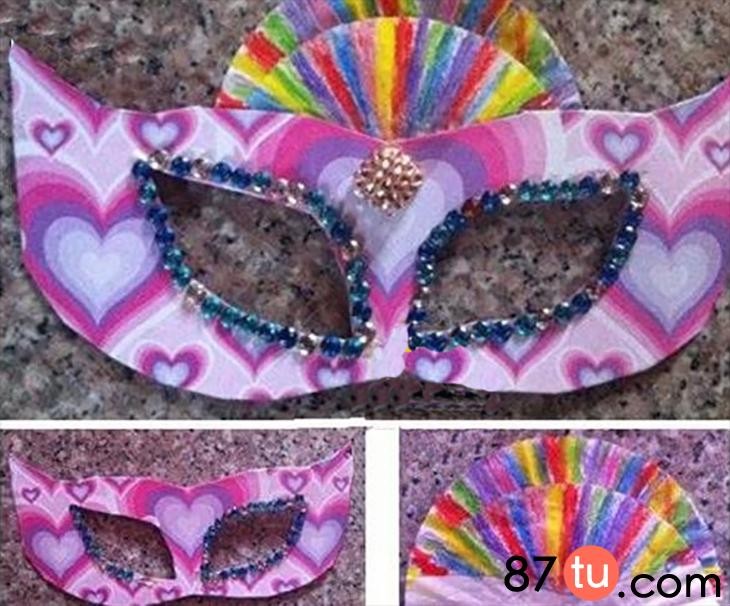 把蛋糕纸对折,涂上喜欢的颜色,粘贴到面具上。还可以将装饰珠子等粘贴到面具的正面。