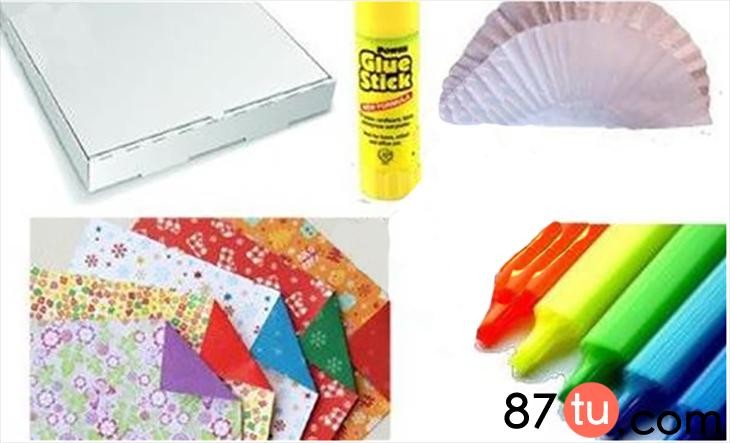 一个废弃纸盒、彩色包装纸、蛋糕纸、彩笔、松紧带、胶棒。