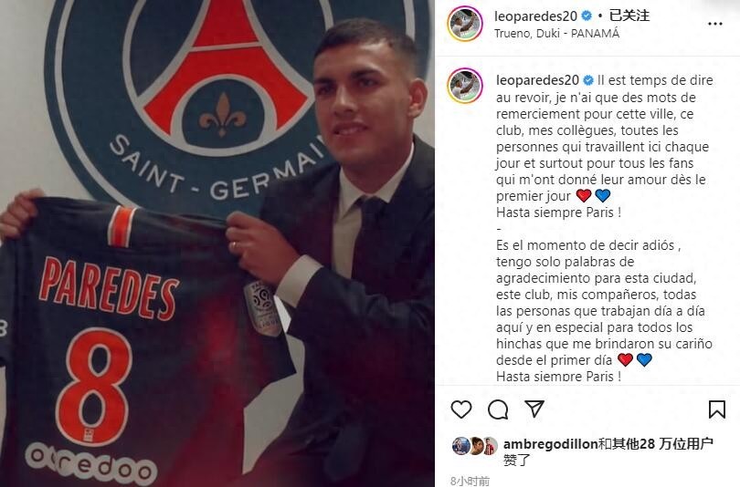 帕雷德斯在Instagram上写道:“现在是说再见的时间了,我唯一想要说的就是向这座城市、这家俱乐部、我的队友们表示感谢,谢谢在这里工作的每一个人,感谢从第一天就让我感受到爱的球迷们。巴黎直到永远!”