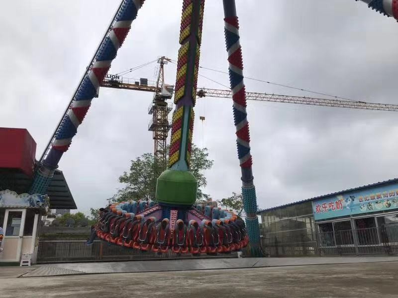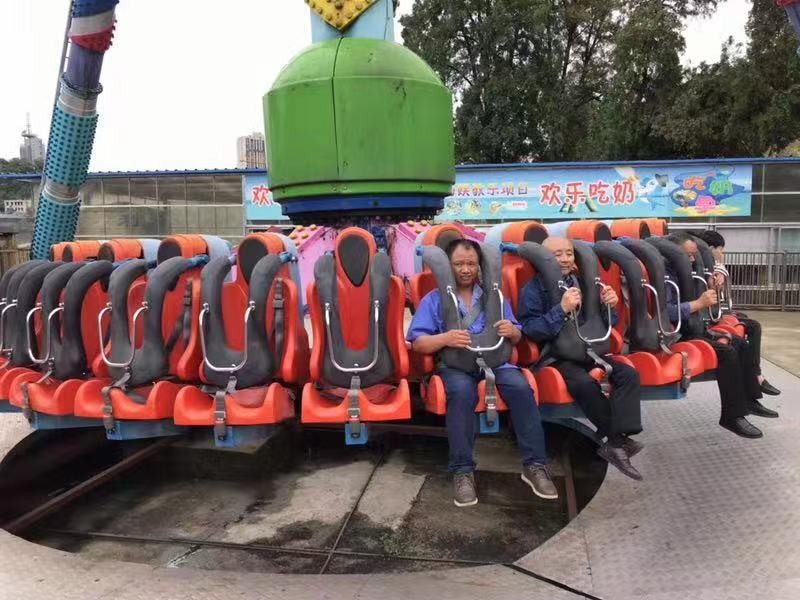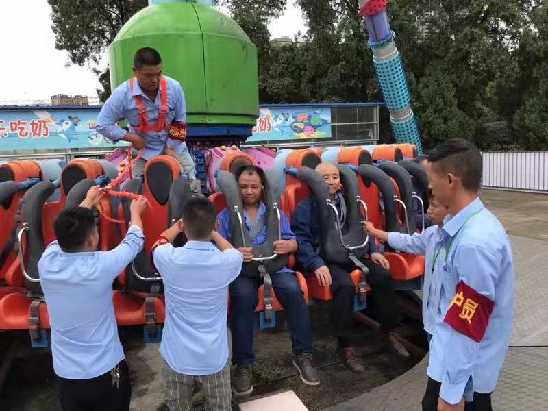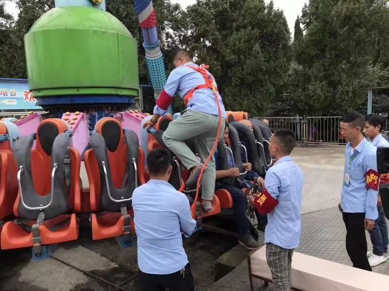 演练模拟游客在乘坐游乐设施“大摆锤”时,突遇设备断电故障,乘客被滞留空中,生命财产安全受到威胁,险情发生后,救援人员立即启动应急救援方案,开展救援行动,帮助乘客从座椅上安全降落至地面。
