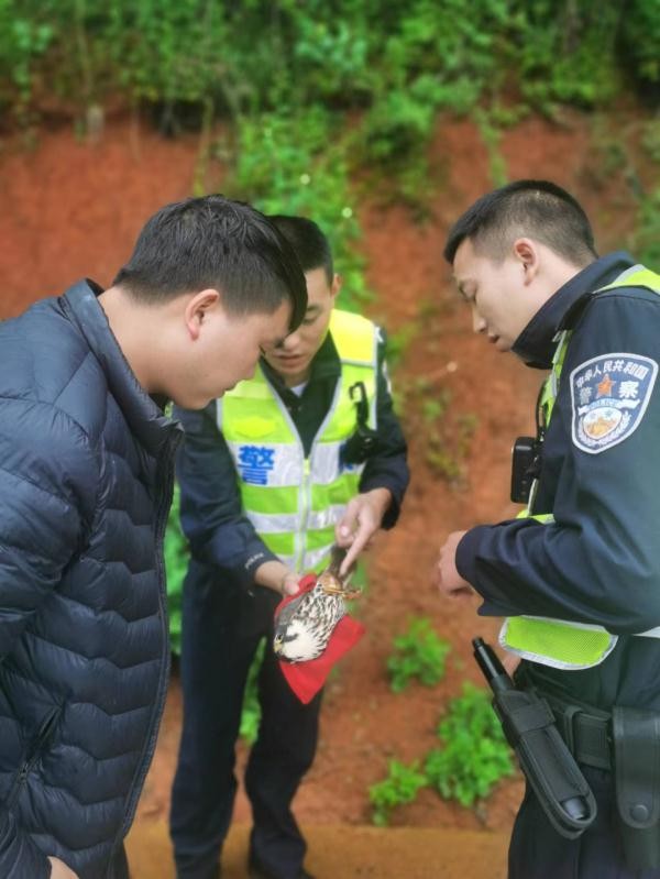 6月12日,昭通市公安局昭阳分局苏甲派出所民警带领辅警在辖区内事故多发地段开展路检路查,返回途中,民警发现一只小鸟在公路上无法飞走,立即下车查看。