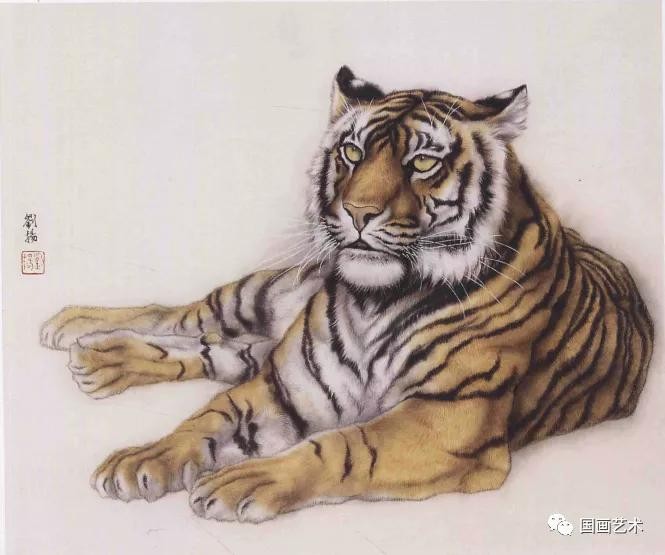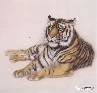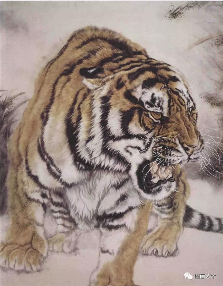 步骤三:深入刻画。用狼毫笔趁湿撕出黑色斑纹与黄色毛丛。黄色毛丛以朱磦与淡墨着色。完成后,选用花青、曙红加少许淡墨,依照虎之结构渲染数遍。最后以藤黄、花青、朱磦渲染眼与虎鼻,用蛤粉勾出虎须,点虎睛。↓↓↓