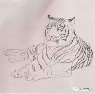 步骤一:选用生宣纸,用铅笔起稿,将虎之结构关系表现准确,将纸喷湿,待半干时,用狼毫笔着淡墨与花青,依照铅笔稿,用“扁锋”撕出虎的形状,力求准确。↓↓↓