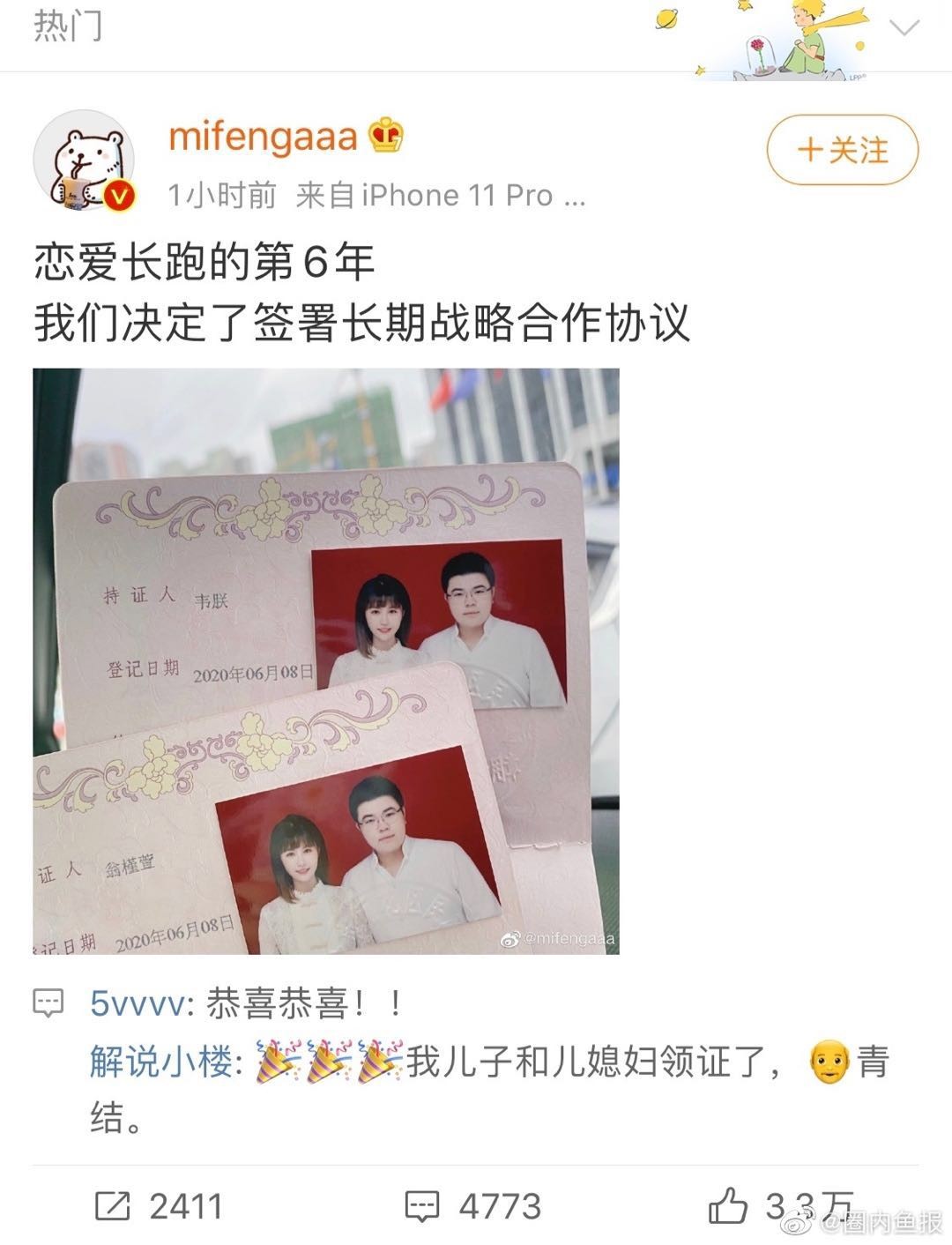 6月8日,绝地求生项目4AM战队GodV(韦神)在微博上晒出自己的结婚证,迅速登上微博热搜。作为电竞圈玩家熟知的模范情侣之一,韦神和蜜蜂仔修成正果,大家也都送上了祝福。