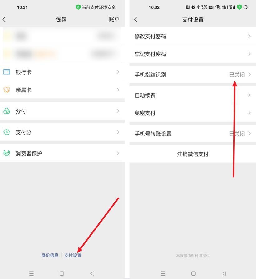 2、进入钱包后,点击底部的【支付设置】,然后找到【手机指纹识别】,默认是已关闭的,我们点击进入下一步;