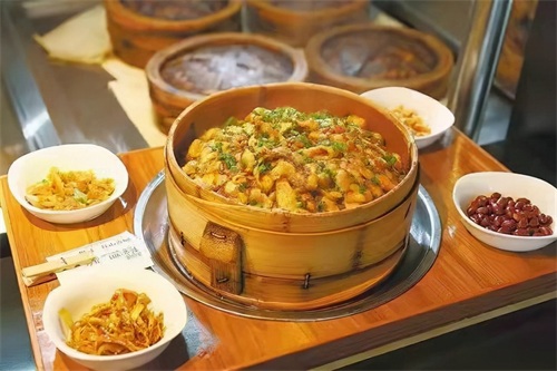 “四星望月”起源于赣州市兴国县,不仅声名远播,烹饪也极为讲究。因为兴国人很喜欢做粉蒸菜吃,竹笼床下面一般都会垫当地的米粉,煮好的米粉同样是拌点当地的辣椒酱,铺在笼床底下,再把腌制好的鱼,一片一片摆上去,用大火蒸六分钟左右,蒸好了浇上稀卤汁就可以上桌了。成菜色泽金黄,四星望月有着清香浓郁、鱼片嫩滑、粉干柔糯、咸鲜香辣的特点,同时也感受不到一点鱼的腥味,还有着发汗祛寒的功效!