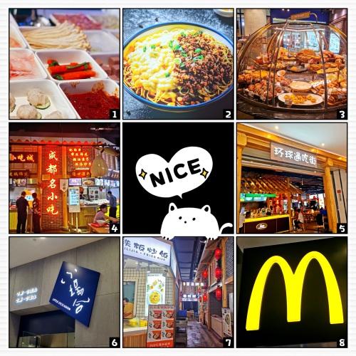吃:环球中心的美食集中在负一层和第四层,其他楼层零星分布。负一楼特色小吃居多,包括成都特色小吃、吉野家、KFC、M、各类茶饮,四层主要是品牌餐厅,绿茶、胖哥俩、厨子下山回锅肉、沸悦(酸菜鱼锅的新式火锅,还不赖),各类菜式,丰俭由人!