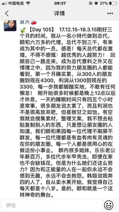 如果不是做水果,现在的生活真的是以前想都不敢想的。没有好的出身也没有高的学习,在这之前,也就是普通的办公室文员。但做微商,别人可能是佛系,但是我觉得自己一定要成功。我的觉得我们每个人的人生都很贵,一定要按照自己喜欢的方式过去下。你总担心别人反感微商,但是我们需要钱的时候,又有多少人愿意来帮助我们?