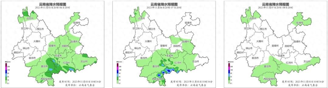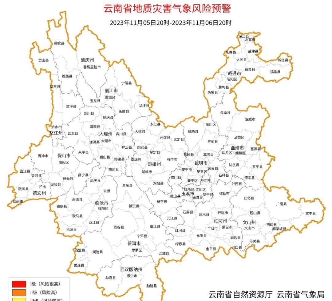 而怒江州北部、昭通市北部、文山州南部、红河州南部、玉溪市南部、普洱市和西双版纳州则会有多云天气,也可能有阵雨。其他地区则会是多云间晴的天气。根据地质灾害的情况来看,从11月5日20:00到11月6日20:00,整个云南省没有发生三级以上的地质灾害。这是一个好消息。在温馨提示方面,首先要提醒大家,11月6日受地面冷空气和南支槽的影响,云南省中东部的日最高气温将下降6-8℃,有些地方甚至会下降10-12℃。这个降温是比较明显的。其次,随着降温的到来,中东部和南部地区可能会有小雨。普洱市东部、西双版纳州东部、玉溪市南部和红河州南部可能会有中到大雨,局部地区甚至会有暴雨。迪庆州北部可能会有小到中雪,局部地区甚至会有大雪。在这个过程中,滇西南地区还有可能出现雷暴和短时强降水等强对流天气。接下来,让我们来看看各地区的天气预报。