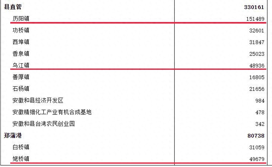 安徽和县常住人口数据:历阳排第一,姥桥、乌江基本持平