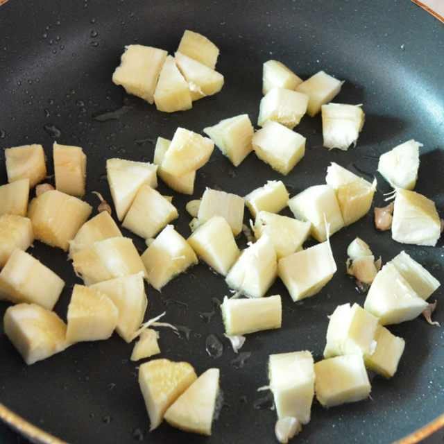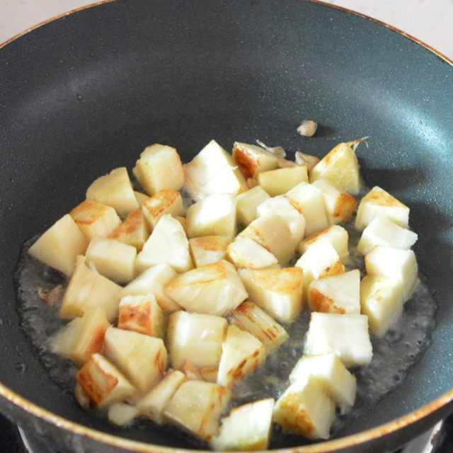 第6步、接着把木薯加进翻炒,并适当加些盐。