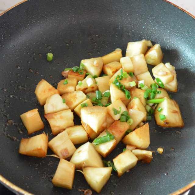 第8步、水份煮干后加些酱油和葱花便可。