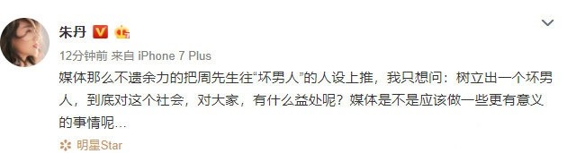 随后,周一围妻子朱丹发文回应此事,称:“媒体那么不遗余力的把周先生往“坏男人”的人设上推,我只想问:树立出一个坏男人,到底对这个社会,对大家,有什么益处呢?媒体是不是应该做一些更有意义的事情呢...”。之后,朱丹删除了此微博。