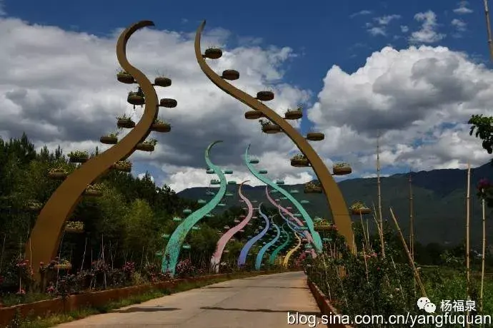 丽江有一个被人称为"玫瑰小镇的村庄",这是建设金桥和龙开口水电站后的为各族438户移民重建的一个村庄。村民包括纳西、白、傈僳、汉等民族。最有特色的是村子房屋建筑独出心裁,传统建筑,七彩院墙,多文化的彩绘,琳琅满目,加上大量种植的玫瑰,在丽江村落中独具一格。这个村子好在构思巧妙,独创在先,因为类似村落是物以稀为贵,多了就又落入模式化了。略为记游: