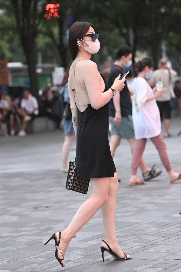 精致的美女,会注意服装搭配的款式,也会注意高跟鞋的款式,这位美女选择一双黑色的细跟凉鞋,10厘米的高度,设计风格也比较简单,前面有亮片点缀,增加层次感,也显得非常好看,一款黑色吊带连衣裙,略微宽松的设计,露背的设计,显得非常优雅,有点礼服的效果,黑色的墨镜,起到很多点缀效果,背带拎包,是深浅色的三角设计,层次感很好。