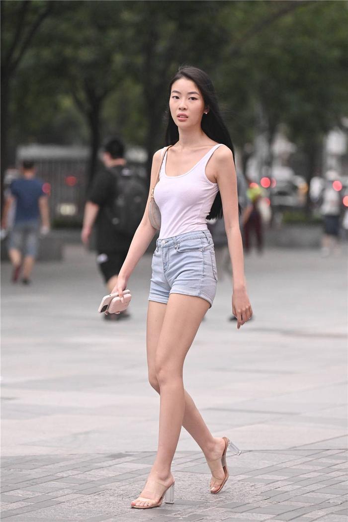夏季里搭配,要简单一些,穿搭是为了清凉一些,要选择一些精致的风格,这位美女穿着一款浅蓝色的紧身牛仔短裤,色彩很淡的设计,搭配一件白色修身的背心,衣襟掖在短裤里面,看起来很简单的搭配风格,也是夏季比较常见的穿搭方式,脚下一双粗跟的水晶凉鞋,鞋面是透明的材质设计,8厘米的高度,更好衬托美女的高挑身材,当然美女身材非常苗条,素以才会这样穿搭。