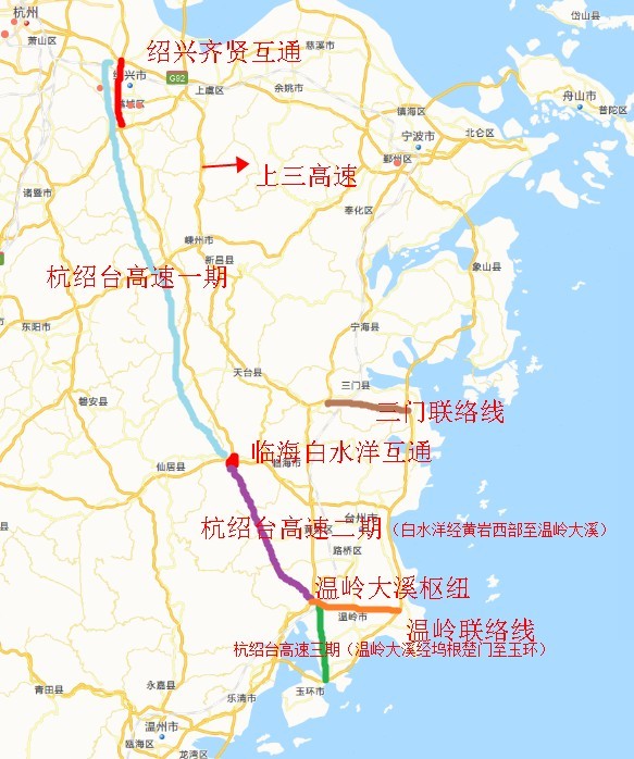 据规划杭绍台高速二期是临海括苍经黄岩至温岭大溪(甬台温高速)。杭绍台高速三期是温岭至玉环(甬莞高速)