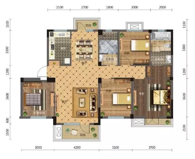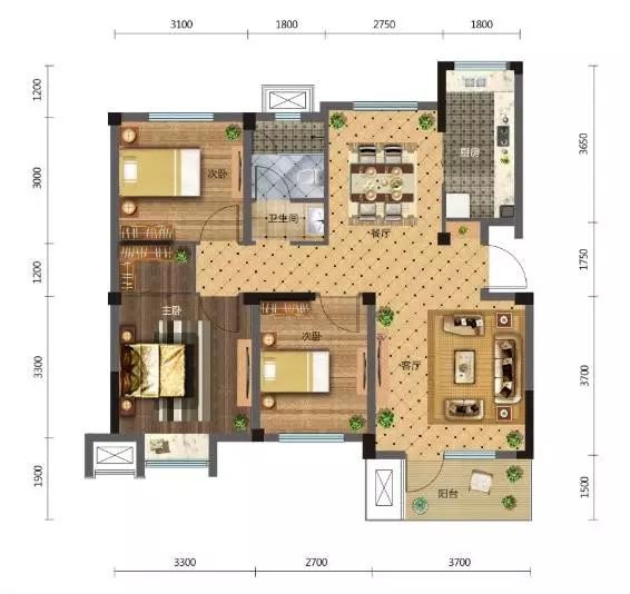户型设计紧凑没有浪费的面积,三个卧室中两个全朝南,主卧带飘窗,客厅带阳台,采光好,整体居住舒适度高,满足刚需客户对于三房的需求。