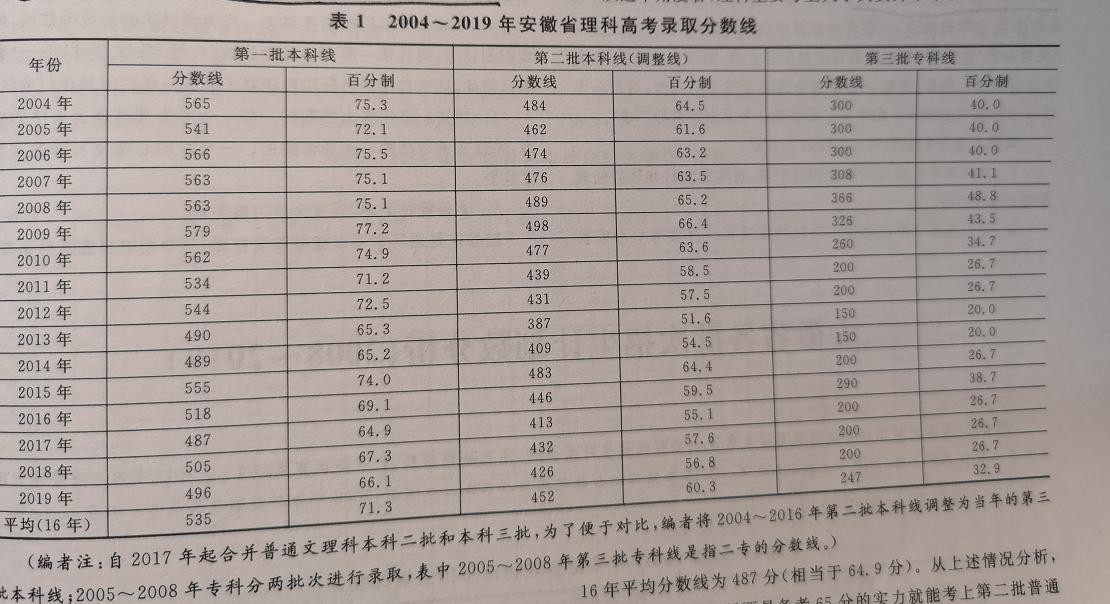 而从2004年到2019年,这16年,安徽的一本线按照一百分来算,平均分是71.3分;二本线是60.3分。